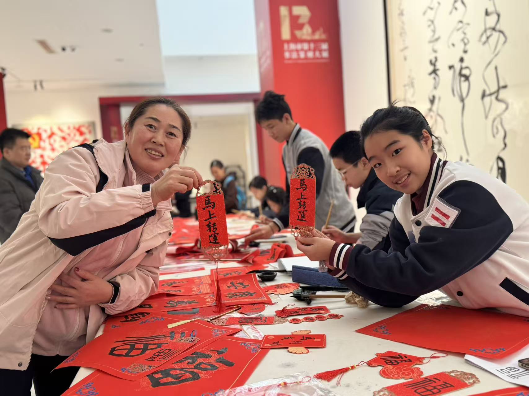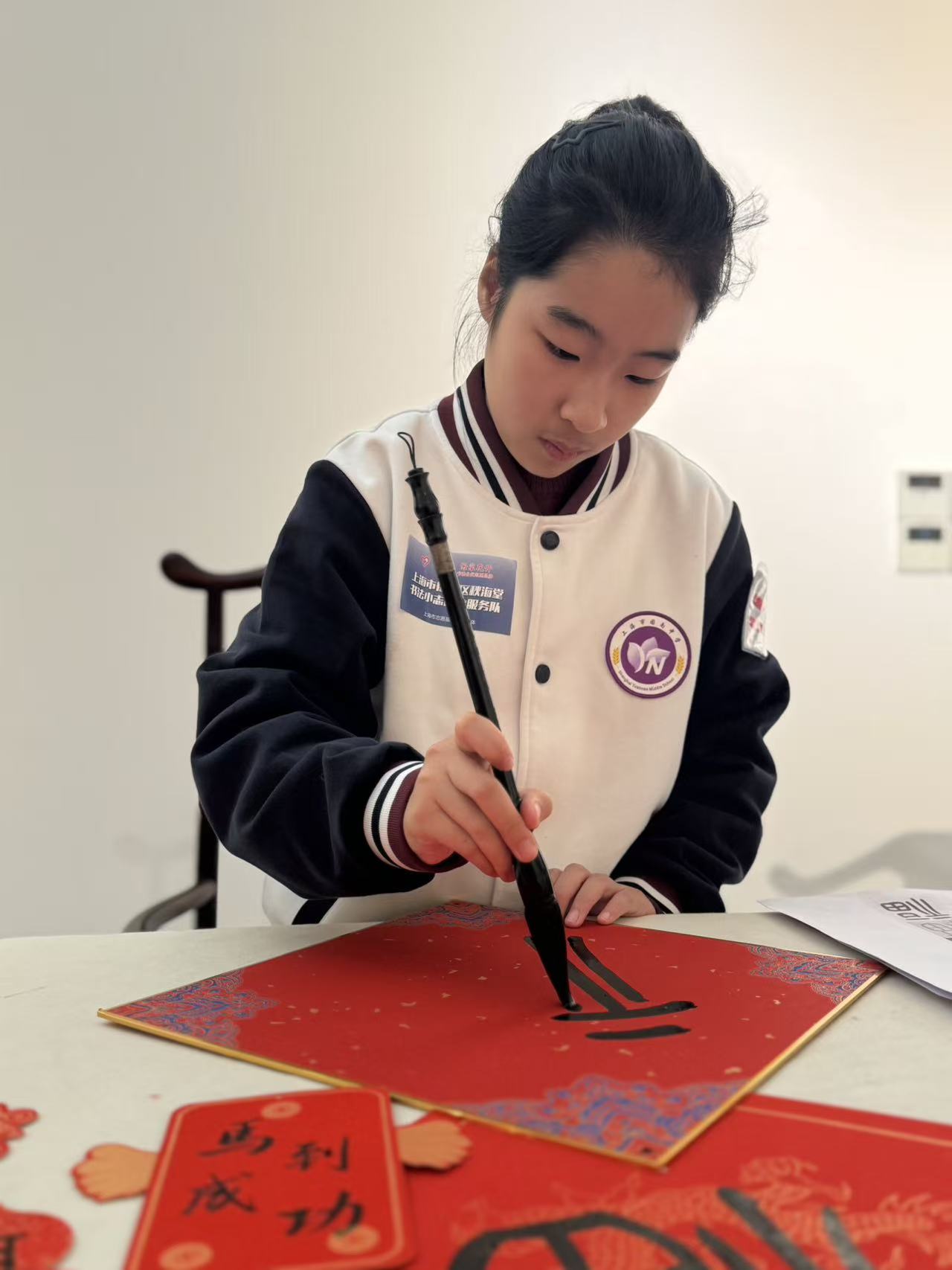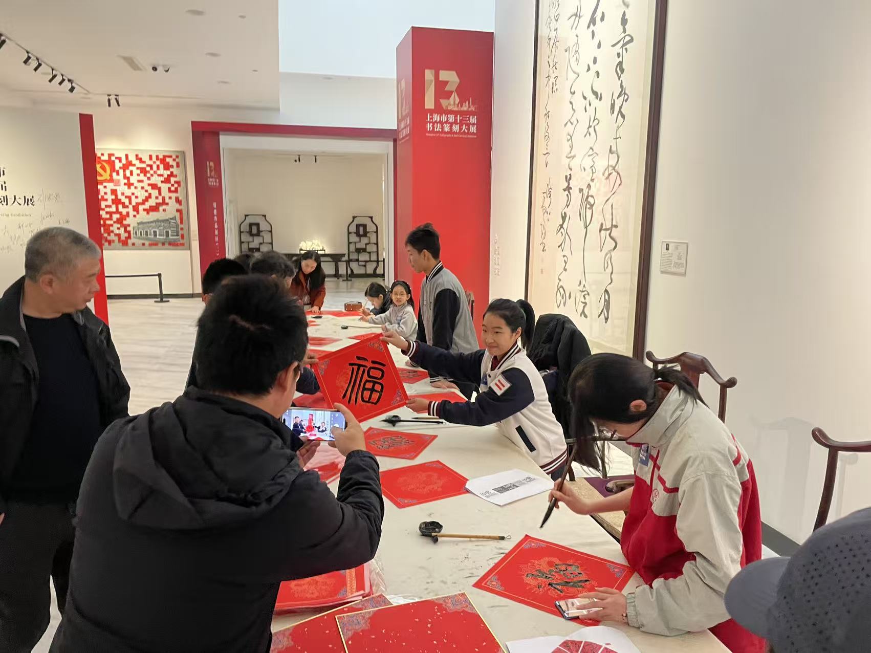 12 月 20 日,在上海市第十三届书法篆刻大展现场,大无限学员夏星妤,以饱满的热情参与了 “送福迎新” 志愿活动。