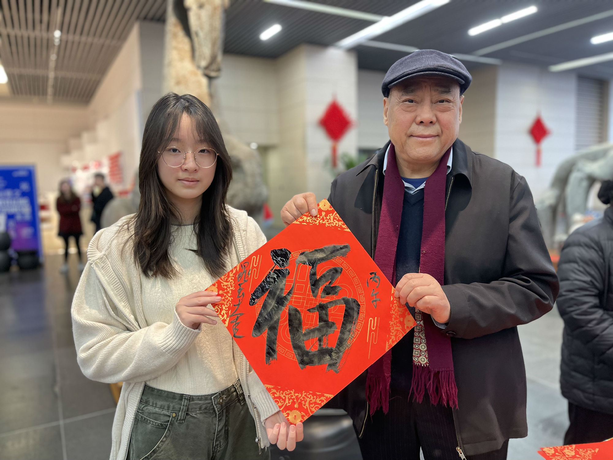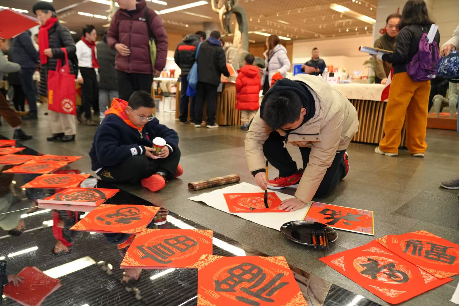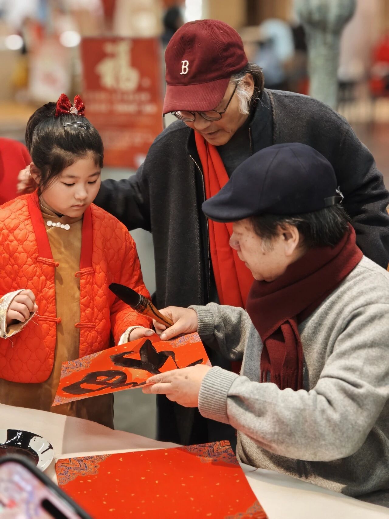 席间,孩子们难掩对名家笔墨的喜爱,纷纷围拢到各位书法家身边。递上红纸,一句新年大吉,我也想求个福字,可以吗?书法名家们欣然应允,俯身挥毫间,还不忘向孩子们讲解笔法要领,孩子们听得认真,看得入迷。稚子与名家,以笔墨结缘,以福字传情,现场暖意融融。