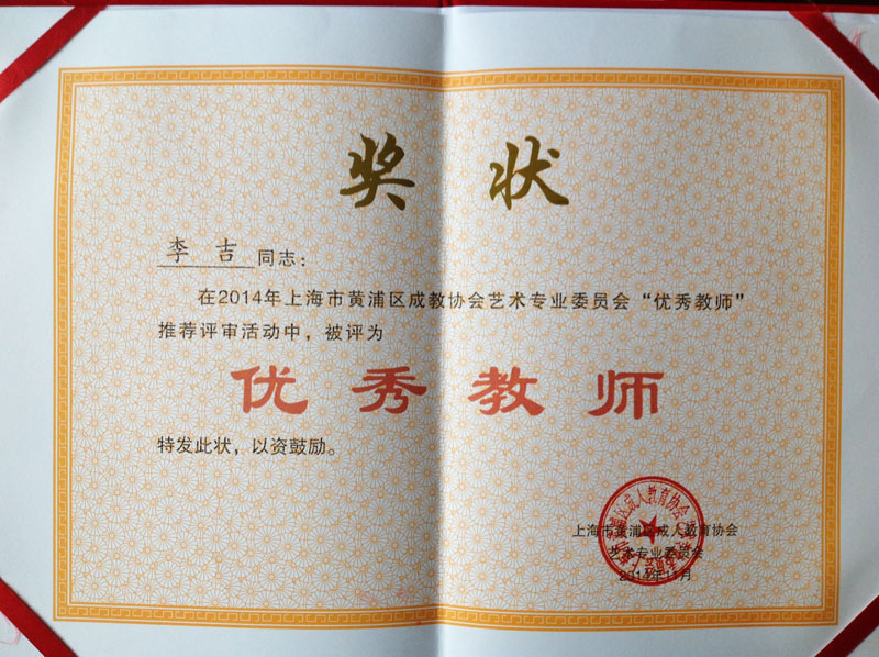 近日,大无限艺术学校教师李吉、吴叶舟在2014年上海市黄浦区成教协会艺术专业委员会“优秀教师”推荐评审活动中,被评为“优秀教师”。【图为:李吉奖状】