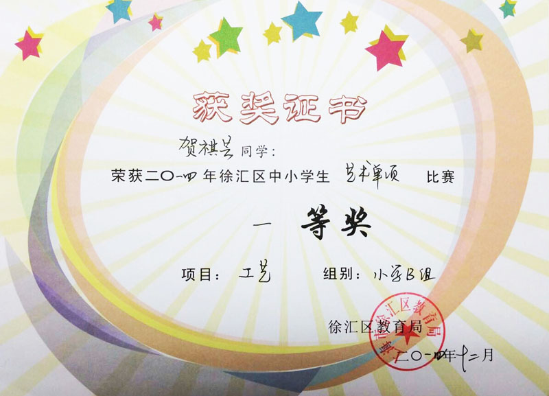 近日,大无限艺术学校学员贺祺芸在由徐汇区教育局主办的“2014年徐汇区中小学生艺术单项比赛”中荣获工艺项目小学书画一等奖。【图片依次为作品集封面、荣誉证书】