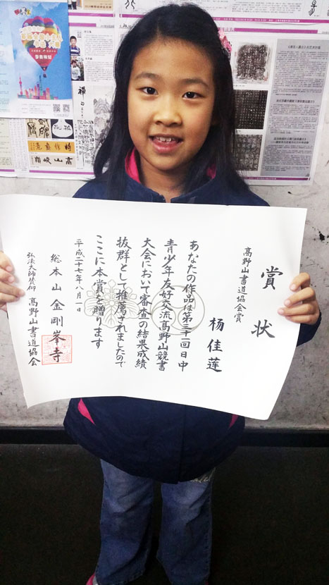 据上海市书法家协会消息:大无限艺术学校学员杨佳莲、宋厚成在第31届高野山青少年书法竞赛中荣获“书道协会奖”。