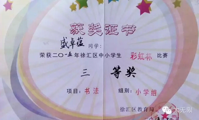 徐汇区教育局讯  大无限艺术学校学员盛卓蕴在2015年徐汇区中小学生“彩虹杯”比赛中荣获书法小学组三等奖。