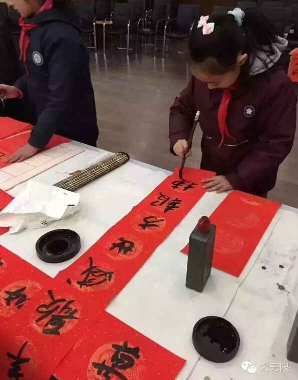 近日,在徐汇区五月苑社区活动中心里,红红火火的开展了名为“老少写春联”送祝福的活动。在樱花园小学就读的大无限艺术学校学员缪雪、刘鸣跃、陈梓舟、张嘉雯与上海市书法家协会主席周志高一同为社区的居民写春联送祝福。席间,周志高主席与4位学员亲切交谈。活动后缪雪还接受了媒体的采访。
