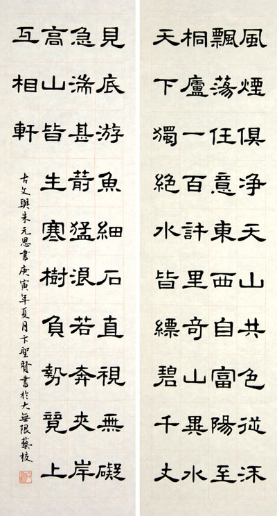 五岁开始学习书法,先后学习过欧阳询的九成宫、皇甫君碑,王羲之的圣教序,米芾的蜀素贴,隶书史晨碑等,并多次获奖。