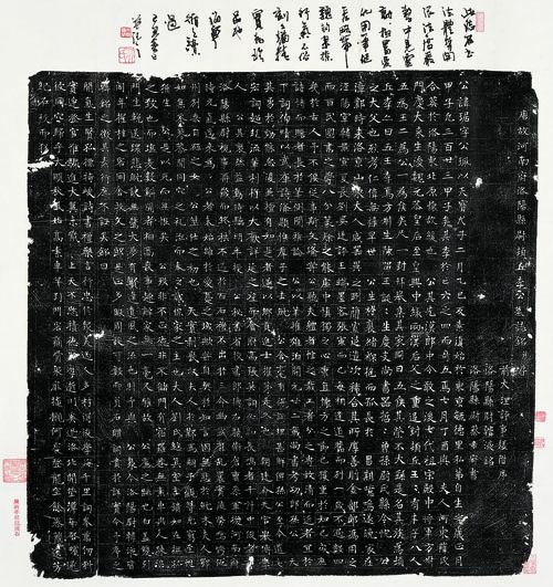 《李琚墓志》,全称《唐故河南府洛阳县尉顿丘李公墓志铭》。李琚,字公珮,东京(今开封)毓德里人,天宝戊子七月葬于洛阳东北原。志文共33行,满行33字,高宽二尺二寸。志石完整,仅损四字其中三字尚可辨。书法极精,正书,有隋人笔意,用笔挺秀略带魏钩隶捺,法度严整中灵动和变化。志石原藏曲石精庐,盖有“腾冲李根源藏石”印。此拓本今藏海宁吴氏天乐斋,收藏家吴元起读过,盖有“元起”、“吴元起藏金石文字之印”等三章。