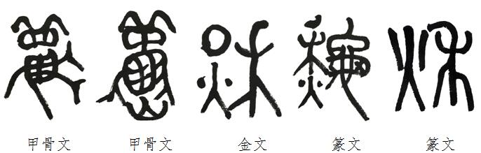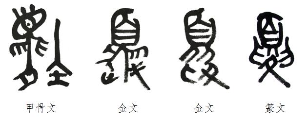 金文比较省略,去掉甲骨文中蟋蟀的躯干部分,还误将甲骨文字形“长鬚”,写成“禾”。把原字形上部的“目”,误写成“口”。甚至还将原意为“烛台”的“火”,真的写成了“火”。籀文还将蟋蟀的躯干写成“龟”的形象,字形面目全非。