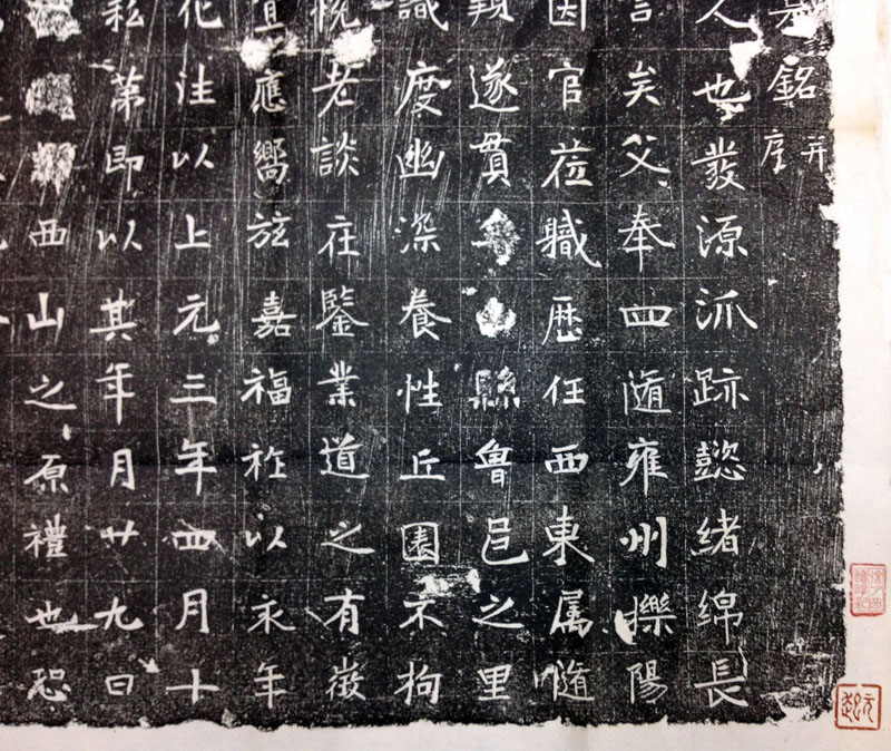 品读志石书法,唐味渐浓,且看得到书丹者已具有褚遂良书法之功底,如第三行头两字“间册”,第五行之“播”字“迁”字,第七行“每游”,第八行“舆善”等字,都能窥见诸书之宽博、滋润的神态。然而,作者的魏碑书法功底扎实,全志文,百分之八十以上的字,显露魏墓志的风格和神采。例如,第四行的“莅职”、“历任”,第六行的“志尚清雅”,第八行的“嘉福”,以及第九的“上元三年四月”等字,全面反映了书志者的魏碑功力。