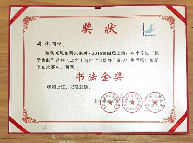 大无限艺术学校学员周伟、周文婕分别荣获畅想邮票未来时·2015第四届上海市中小学生“我爱集邮”系列活动之上海市“储能杯”青少年生肖猴年集邮书画大赛中荣获金奖和铜奖。