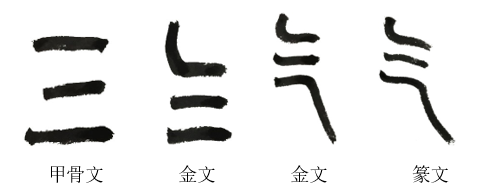 气,在甲骨文中是一个指事字,上下两横表示天地,中间一横代表天地之间的气流。据考,金文为了区别数目字“三”,起笔第一横或上下两横都添加了折笔。篆文的归整,字将“气”字由指事字变成了象形字,真如气流起伏的样子。