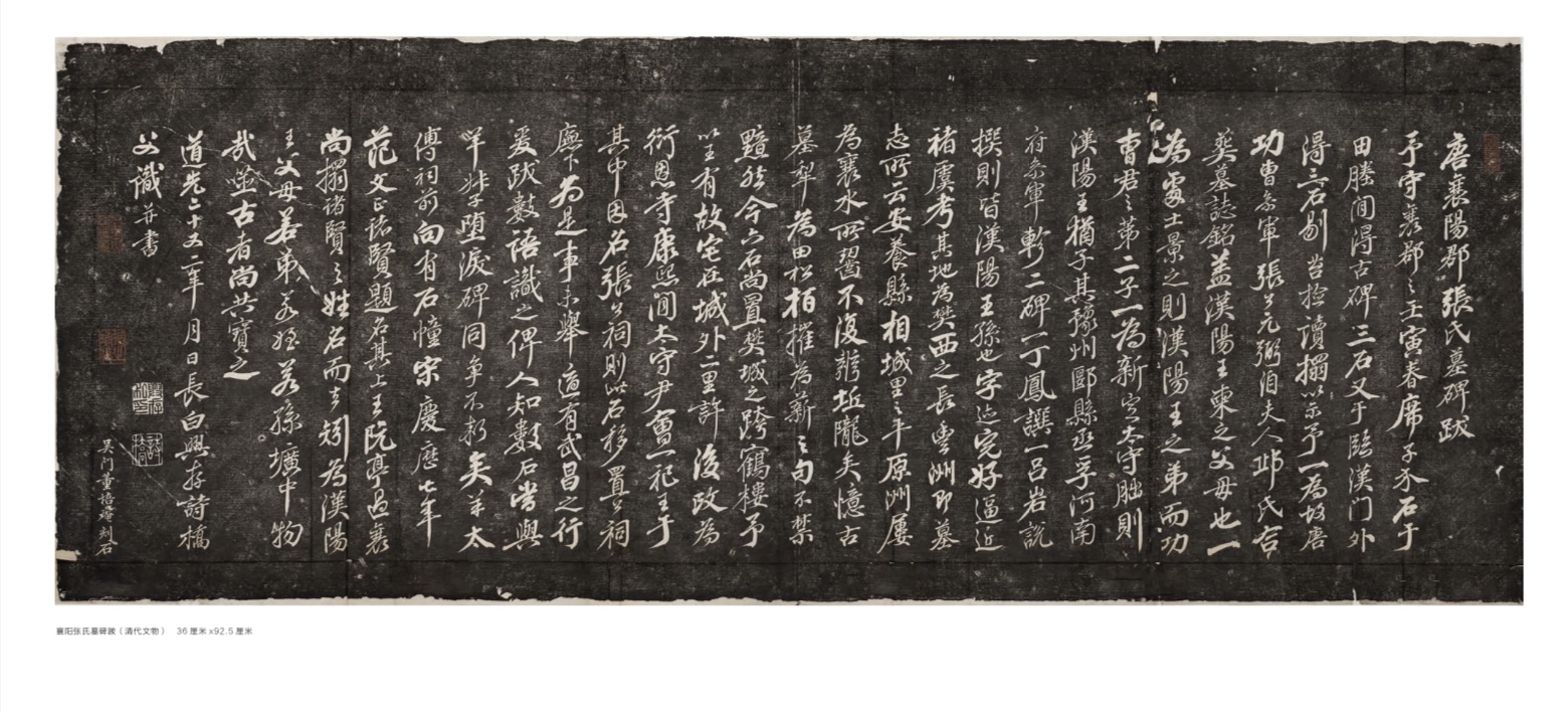 值得一提的是,在这次雅集中除了发现一件以往无记录的,同为张氏家族的《张愿墓志铭》外,还发现一件 《唐襄阳郡张氏墓碑跋》的拓片。拓本宽 93 厘米,高 36 厘米,行书,无书写者署名,只见“父识并 书”。拓片显示,此跋于道光二十二年(1842 年)根据 长白兴存诗桥所立。跋文盖有“兴存私印”“诗桥” 两印。跋尾具“吴门董培庵刻石”字样。跋文详细记录了当时所发现的“襄阳张氏”墓志铭主人与张柬之的关系。