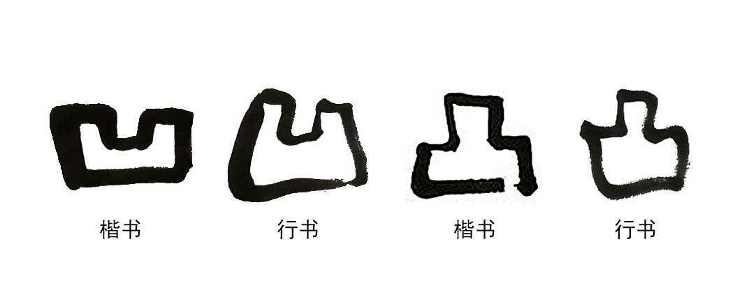 凹凸的奇特,还在于这两个字还可以上下或左右完全重合在一起形成四个不同的闭合的方块。凹是阴,凸为阳,阴阳可互补,可合二为一,成为一个新的整体。