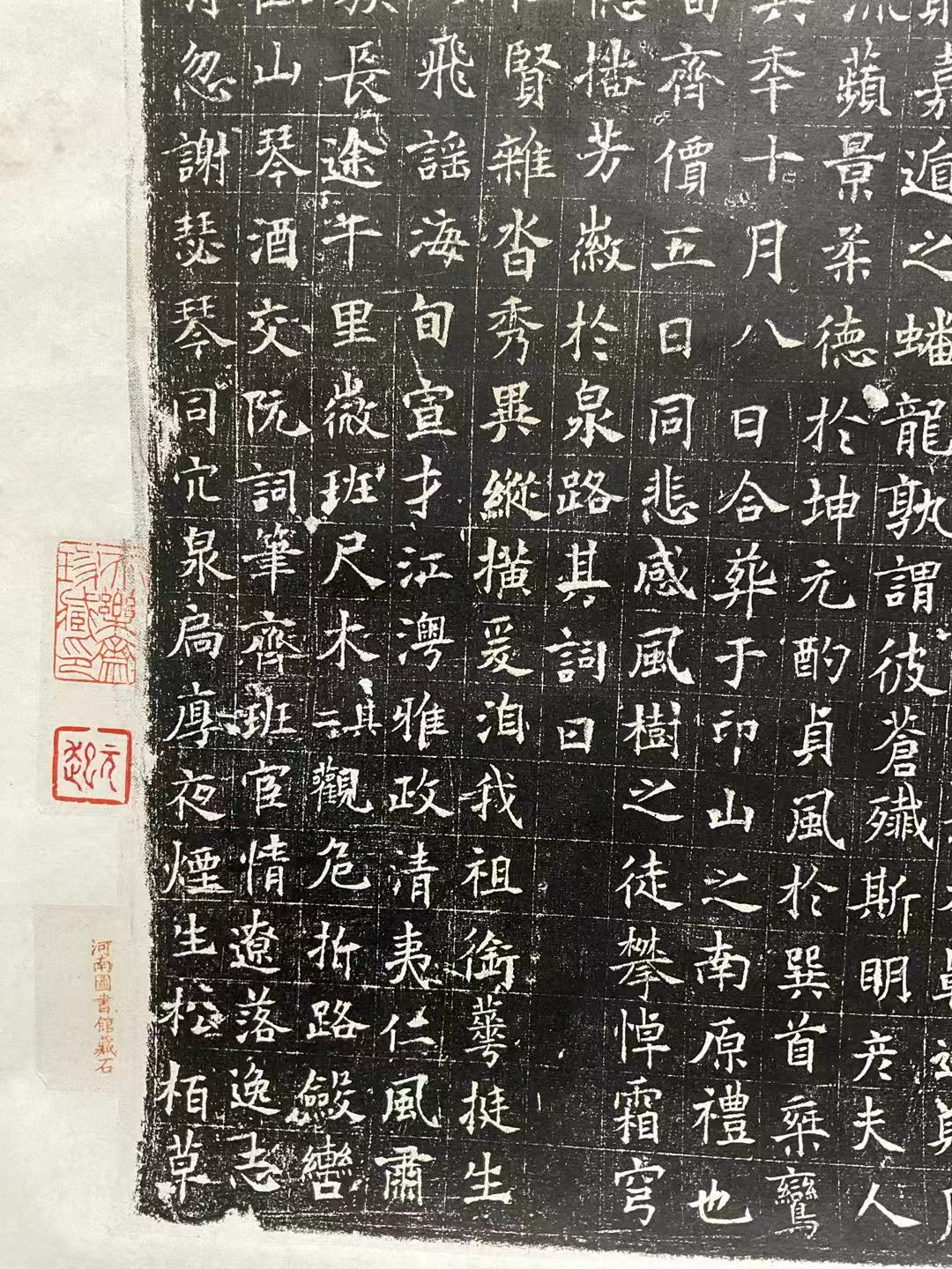 珠躔啟貺,白水飛英,仁賢雜沓,秀異縱横。爱洎我祖,銜華挺生,於惟厥考,佩實揚聲,其一。飛謠海甸,宣才江澳,雅政清夷,仁風肅穆。英英君子,鸞鳳其族,長途千里,微班尺未,其二。觀危折路,斂轡方還,開扉面洛。製宅臨山。琴酒交阮,詞筆齊班,宦情遼落,逸志清閑,其三。雅趣何窮,藏舟忽謝,瑟琴同穴,泉扃厚夜,煙生松柏, 草 (石止此,文未完。)(周紹良藏拓本 開封博物館藏石)