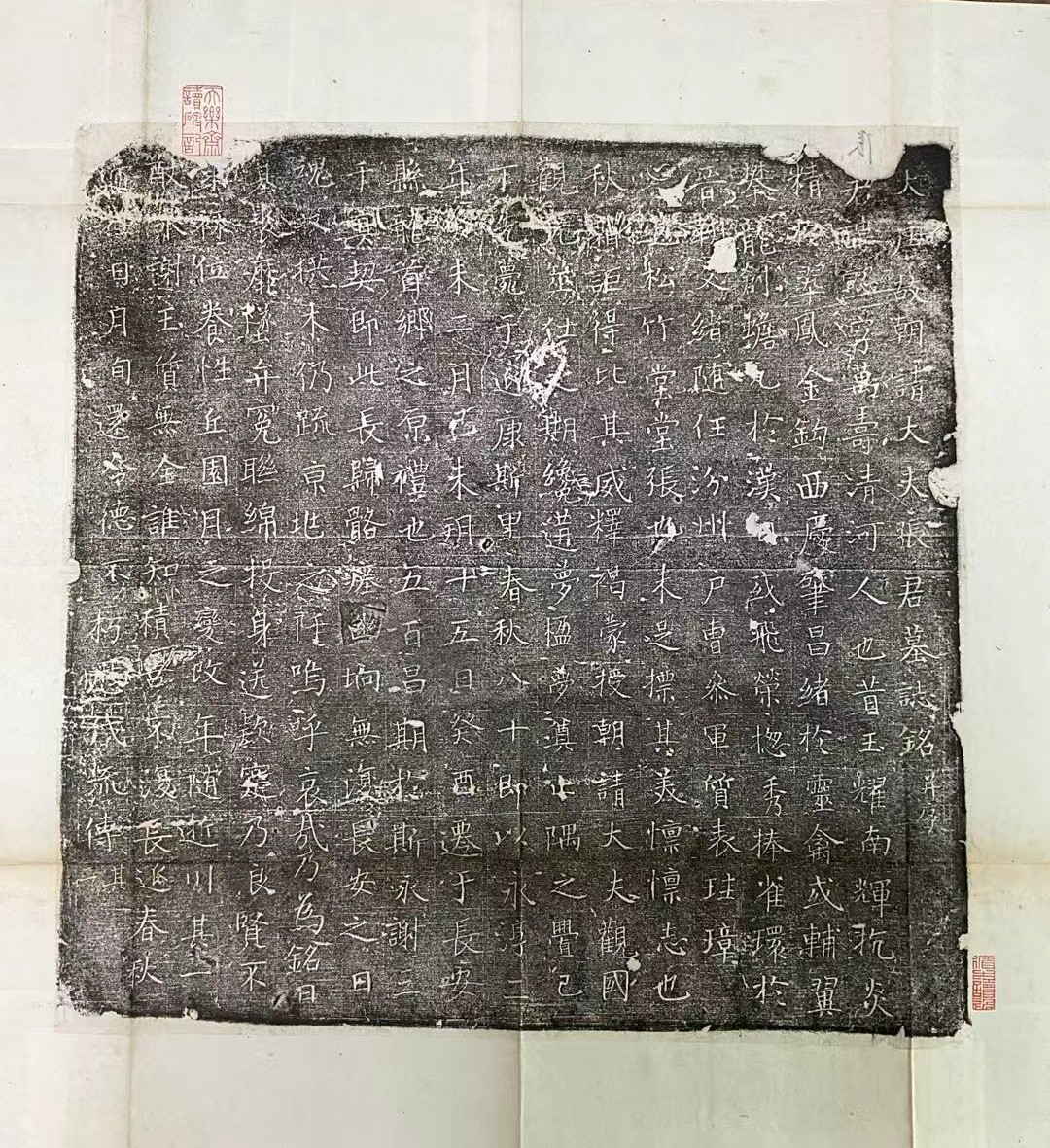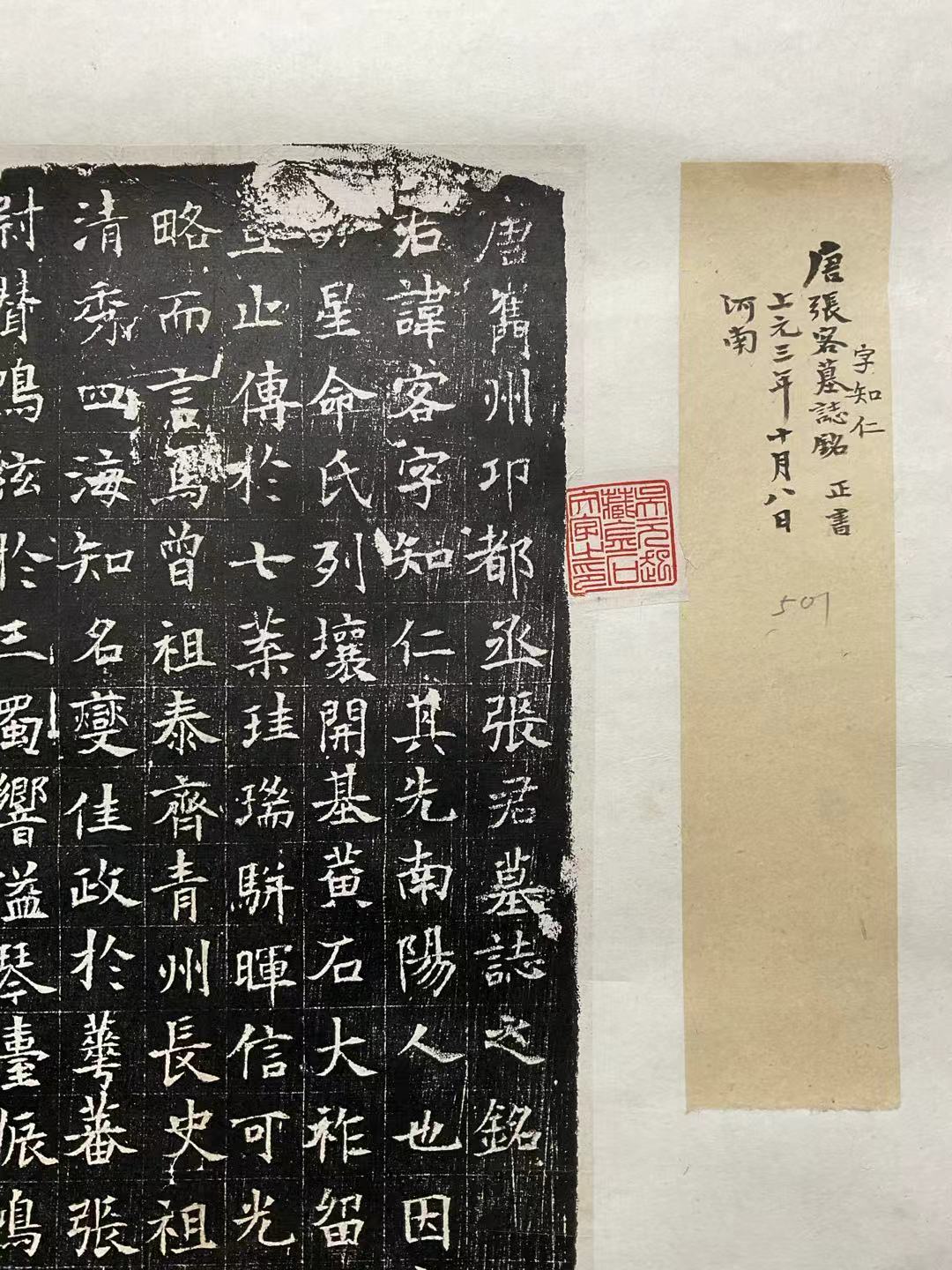 唐张客墓志出土于河南省洛阳,志石52厘米× 52厘米,界格,正书24行,满行24字,计550余字。澉浦天乐斋藏拓本,钤有"河南图书馆藏石""天乐斋珍藏印"、"循之读过"等印。另外,此拓本还有收藏家吴元起题跋,留有"元起""吴元起藏金石文字之印"和"徐乃昌读碑记"等印,可见此拓本的流传过程。