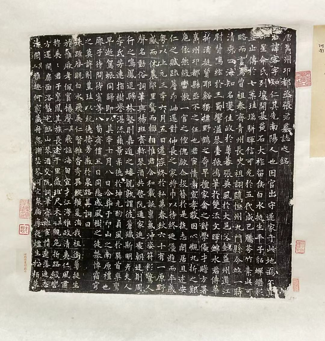 根据《张客墓志铭》的记载,我们在天乐斋的藏品中,找到了张客父亲《张懿墓志铭》拓本。拓本有跋"石藏浭阳端氏",浭阳隶属今河北丰润。端氏,此指金石文字学家、收藏家端方。志石40厘米×40厘米。全称《大唐故朝请大夫张君墓志铭并序》,他在长安延康里去世,享年八十岁。于永淳二年(公元683年)二月十五日(癸酉日),遵照礼制,迁葬于长安县龙首乡的原野。
