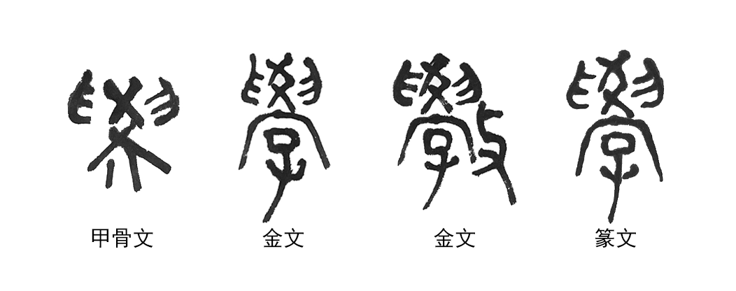 甲骨文的“学”上部中间“爻”表示算筹,“爻”含有交错和变化的意思。上部两侧表示左右手,意为手捧着算筹。下部表示房屋,意指特定的地点。金文“学”字的下部在房屋内添加“子”,又表明了教学的对象。还有金文在下部右侧加上“攴”部,表示持械,体罚受教育者的意思。篆文字形基本同金文。