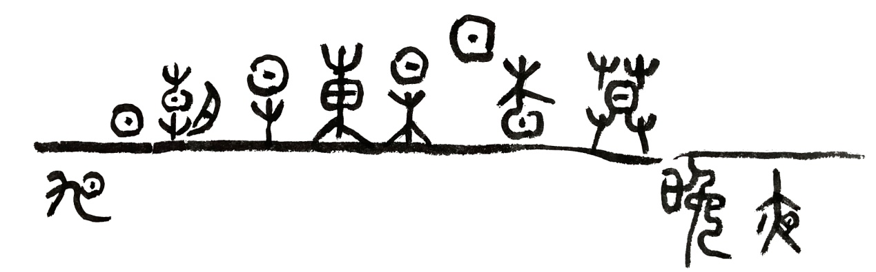 离开地平线的第一个字就是"旦",表示,太阳已经从地平线上升起。第二个"朝",表示,太阳已经升到草丛中央,同时天空中还挂着月亮的情景。第三个"早"字,表示太阳已经升到草的上面。那么太阳继续升高,升到树林的中间时,汉字"东"就产生了。当太阳继续升高,升到树林的头上时,另一个"杲"字就产生了。当太阳悬挂天空的中央时,智慧的古人又创造了两个成语,一个是"如日中天",另一个是"烈日当空"。