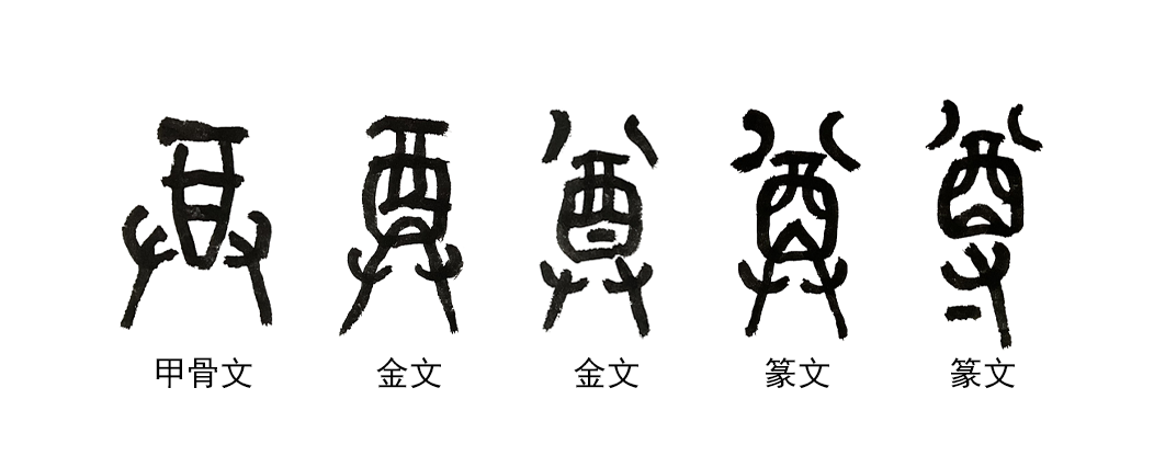 尊,甲骨文酒噐(或称酒罇)+双手(持举),表示双手捧着酒坛。金文和篆文基本承续甲骨文字形,但是也有篆文减去了一只手。造字本义:动词,手捧酒器,献礼祭拜。