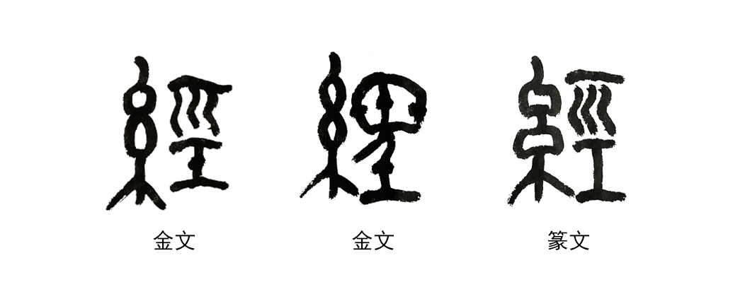 "经"最早见于西周金文,由左右两部分组成。左边为"糸",右边为"巠"。郭沫若《金文从考》认为"经"的本字(初文)当是"巠"。金文中,"巠"上部的三条曲线指纺织机上的"经线",三条曲线的上下方(一+工)表示纺机上固定纺线的框架。大概率是为了使"经线"的概念更加明确,后来在"巠"的左边加上了"糸"。篆文基本延续了金文的写法。造字本义:动词,精心布置织机上的纵线,以便横线穿织有所依据。