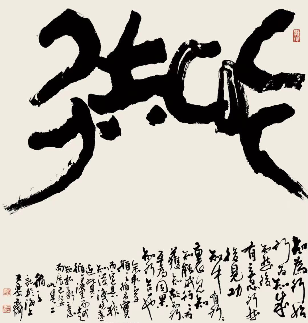 在这些认识的基础上,我又对 “知” 和 “行” 两个古汉字进行了溯源与寻根,强烈地感觉到 “知” 和 “行” 两字合一、难舍难分,这是对 “知行合一” 的最佳诠释,于是这件作品应运而生。我还在作品下方补白:“知为行始,行为知成。知然后有意,行然后见功。知中有行,行里见知。知能成行,行而获知。故知行互为因果,知行合一也……”