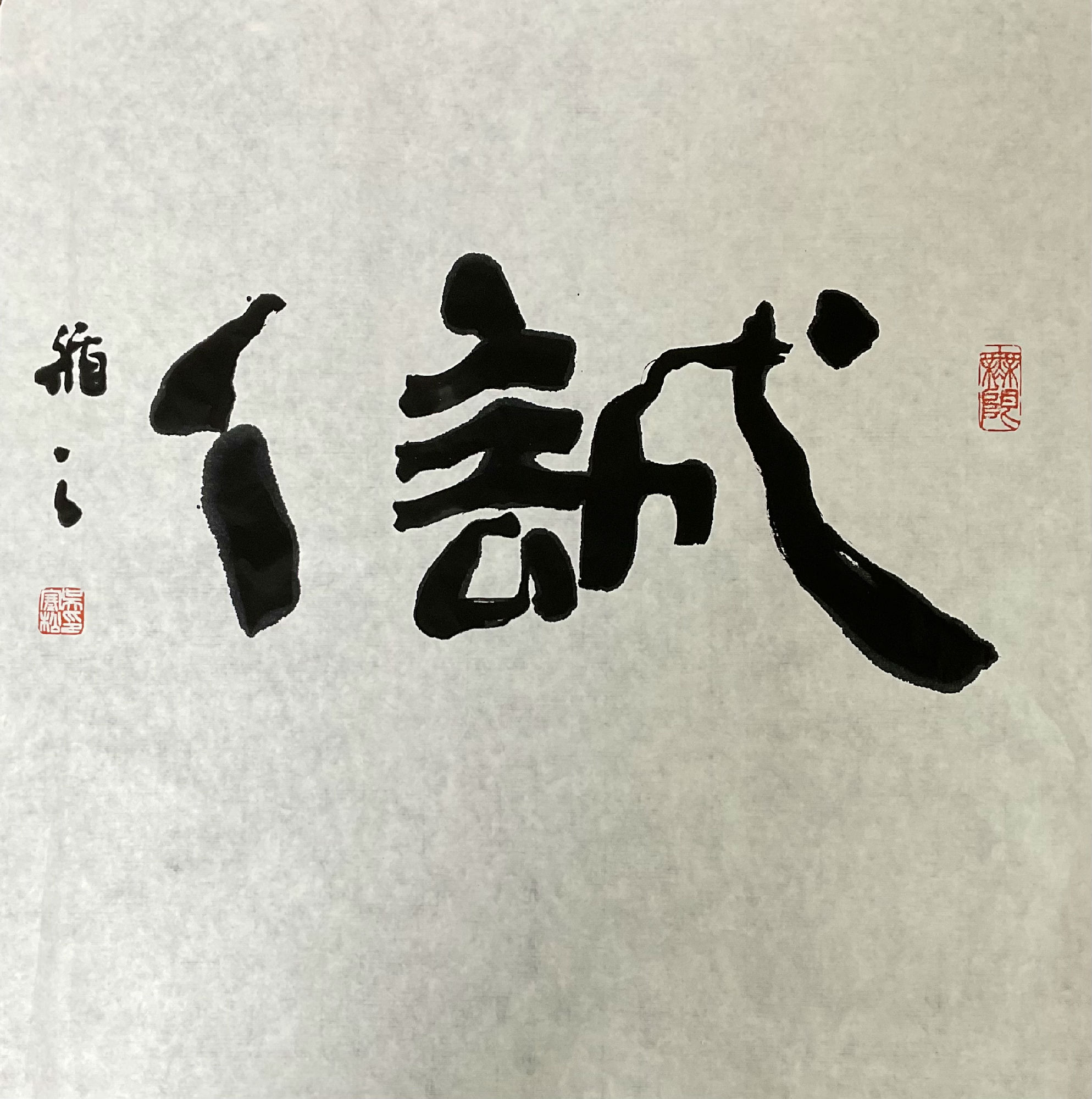 《诚信》这件作品的出镜率较高,但书写起来并不顺手 —— 由于传统书写方式是从右到左,“诚” 字左边有 “言” 部,“信” 字右边有 “言” 部,两个 “言” 碰在一起,总让人感觉不协调。因此,我在创作时减去了一个 “言”,既让视觉感受更舒服,也增添了作品的 “巧思感”。这幅作品从右到左读是 “诚信”,从左到右读则可拆为 “人、言、成”,合起来能解释为 “说到做到就是成功”,含义既深刻又巧妙 —— 这不正是 “诚心诚意” 的本来含义吗?也正因这个创意,《诚信》的出镜频率变得更高了。