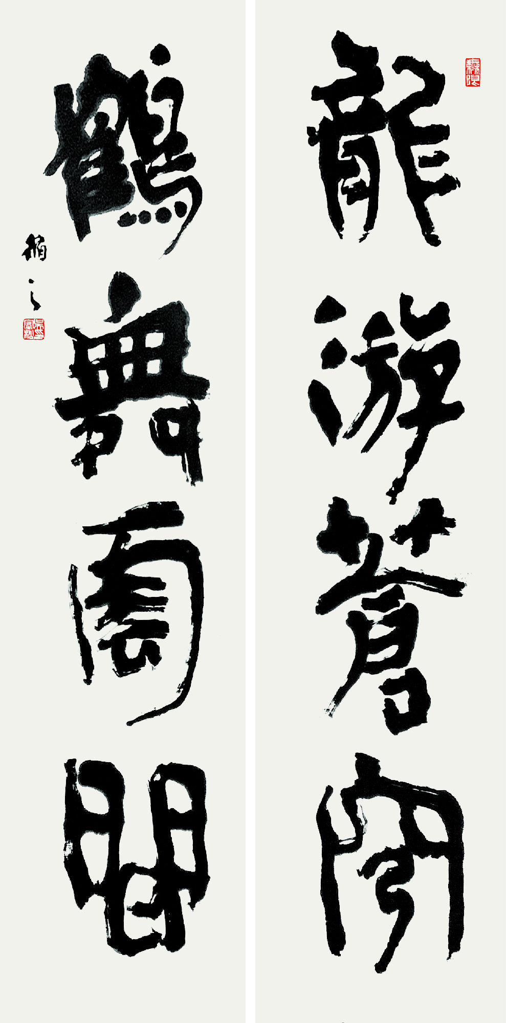 该作品以「篆骨隶体」的方式书写,充分运用「鱼」「水」「鸟」「林」等象形汉字,书写自然起伏,整体既具有隶书的基本特色,又有写意大草的风格呈现。力求呈现「鱼得水」和「鸟归林」的自然生态,笔墨舒展且充满动态感,题跋与正文形成「文与形」呼应的叙事性。