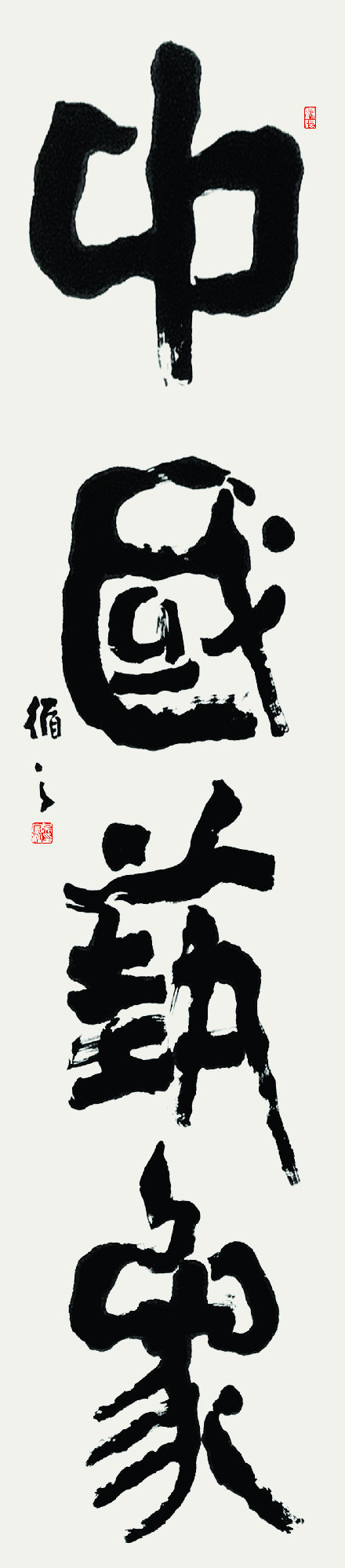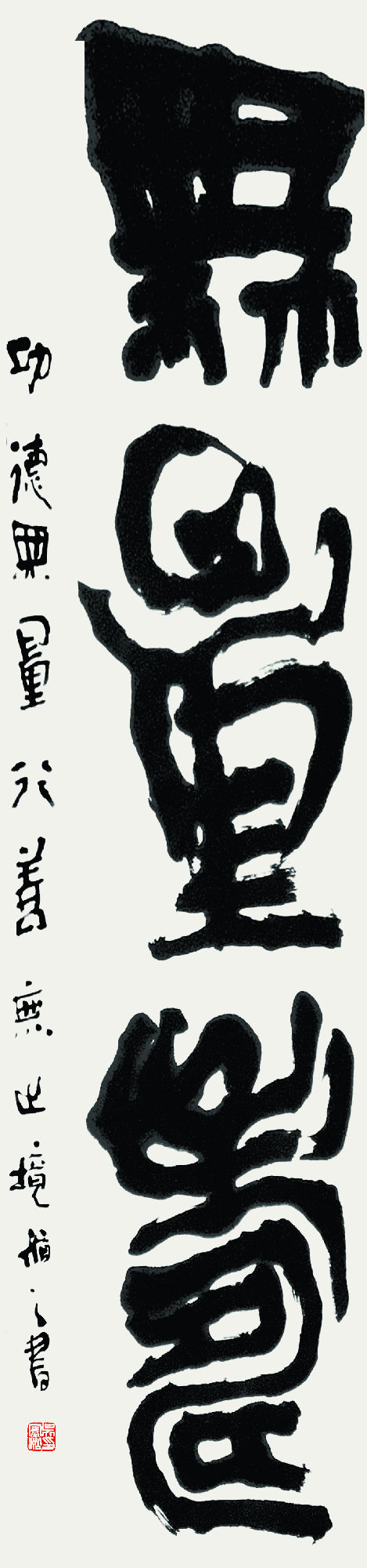 此外,这是一件八尺高度的作品,每个字的宽度约在六十公分左右;因字体硕大,创作时需置于地上书写,或因写字姿势的改变,挥写中产生了平日在桌面上不可能出现的厚重感。